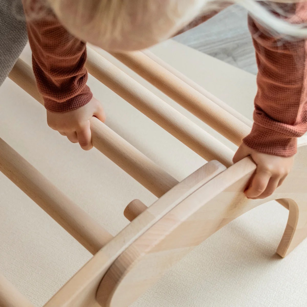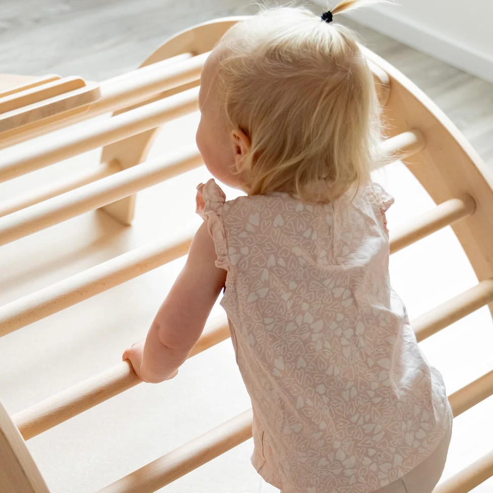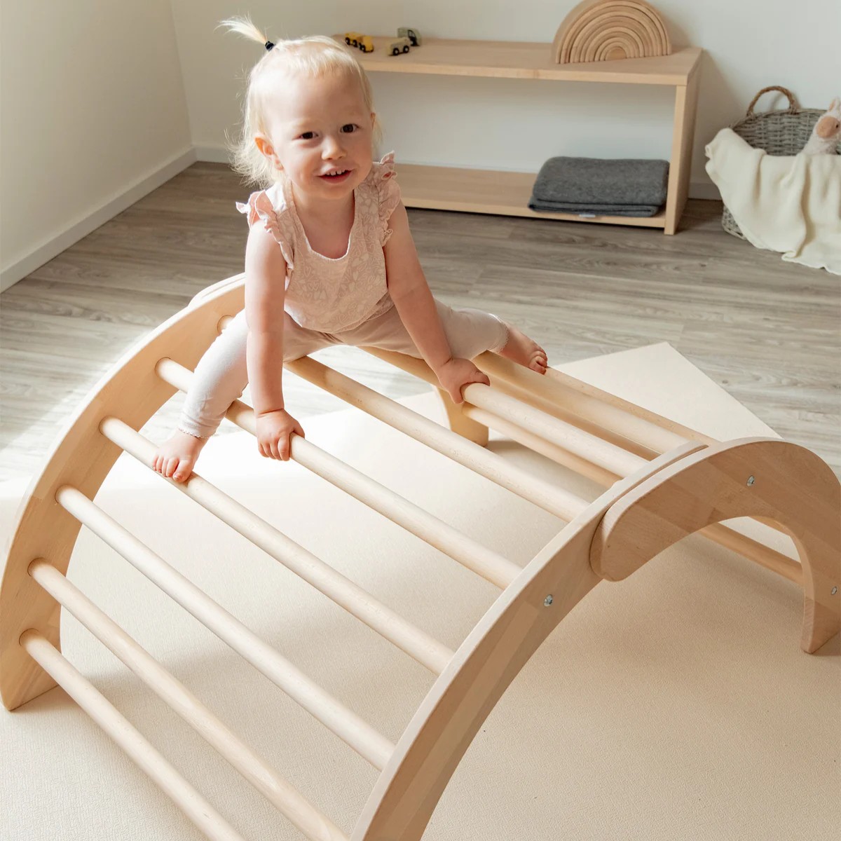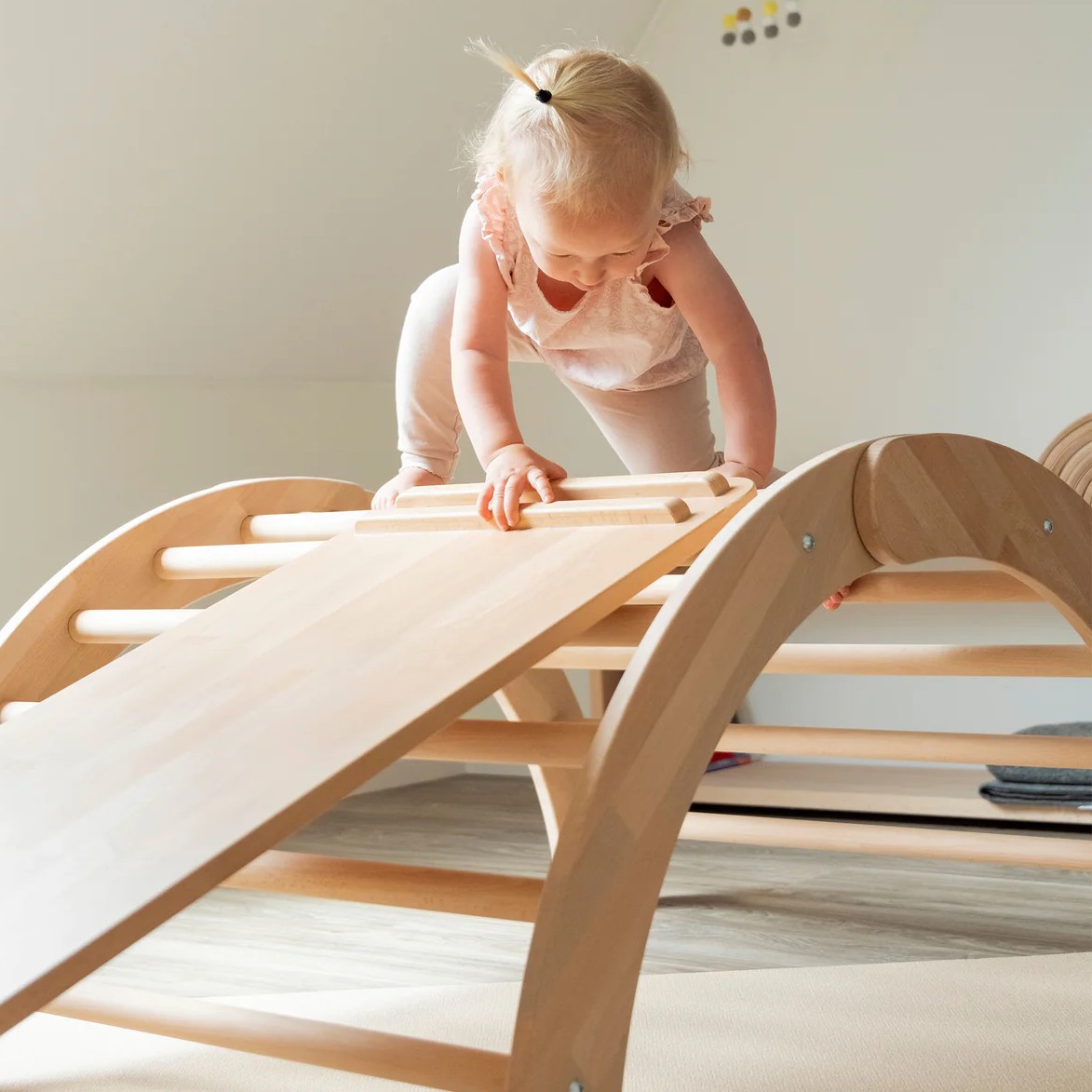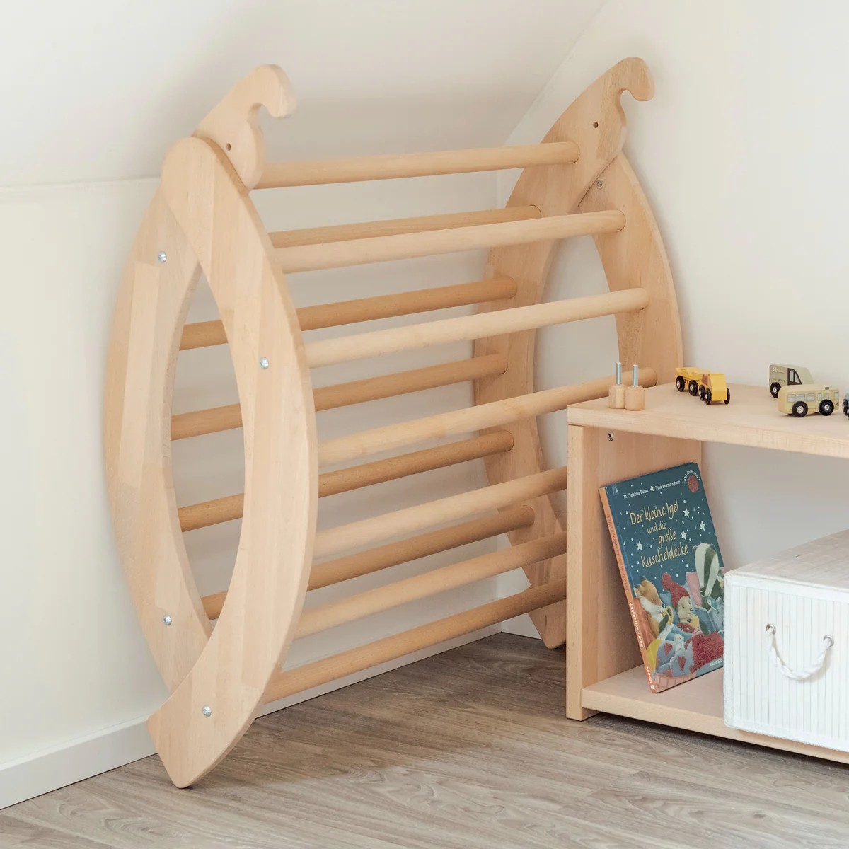 Vielseitiger Kletterbogen aus Holz – nutzbar zum Klettern, Schaukeln oder als Höhle. Fördert Kreativität und Bewegungssicherheit.