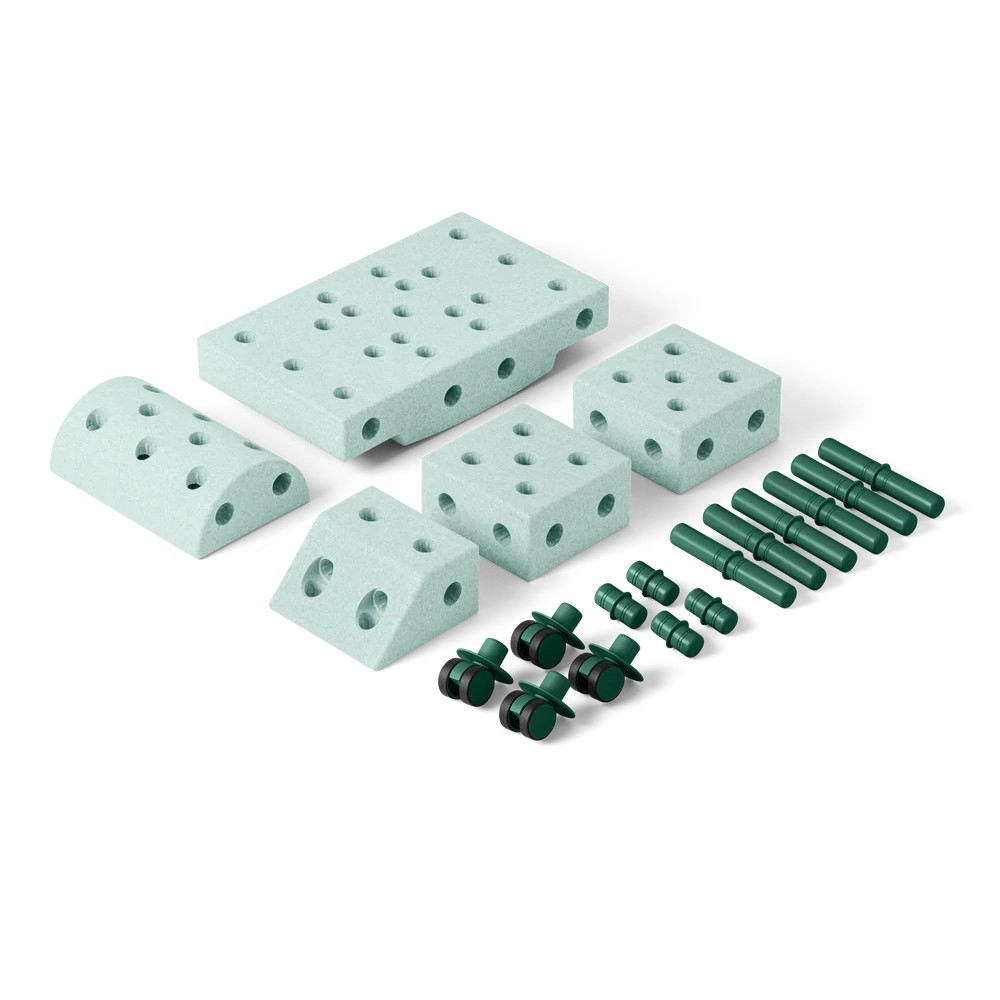 - 20 Elemente (5x Blöcke, 10x Verbinder, 4x Drehrollen, 1x Inspiration Booklet)