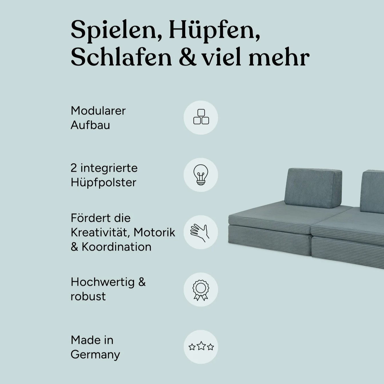 Multifunktionales Kindersofa aus weichem Cordstoff – nutzbar zum Hüpfen, Toben, Kuscheln und Lesen. Die Hüpfpolster fördern Motorik und machen das Sofa zum Lieblingsplatz im Kinderzimmer.